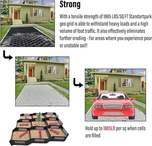 • - Premium HDPE Material ---> The ground grid paver is made of HDPE material with which is supersonically welded for tensile strength and high lateral. The landscape geo grid is 1885 LBS per square inch of coverage each unit when cells are filled.
