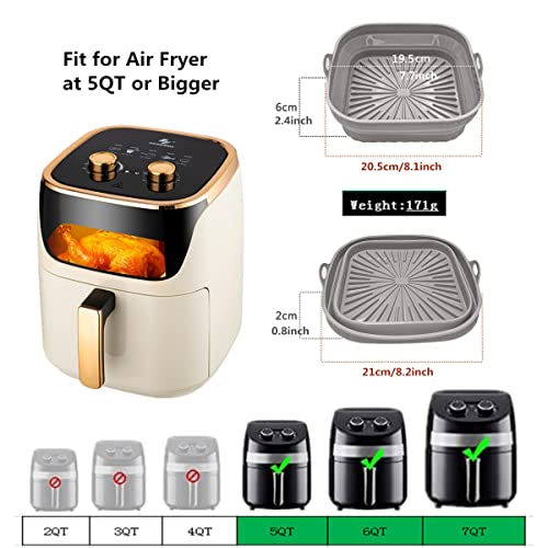 • 【Multi-functional Air Fyer Silicone Pot】:21x21x6cm/8x8x2.4inch(LxWxH), square size,usually handles food more efficiently and fits better than the round ones, it can be used for a wide range of brands and models of air fryers at 5QT or bigger,and it can be used not only for frying but also for steaming, baking, boiling and stewing, allowing you to create more dishes.