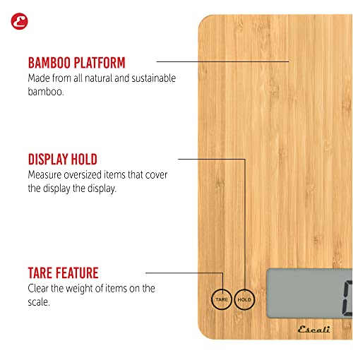From the manufacturer Escali’s innovations in quality, accuracy, value and style are shaping the future of measuring technology in home and business settings. Escali offers a full line of kitchen scales, body scales, timers and thermometers. Synthesizing contemporary design with unmatched accuracy, Escali products are sold around the globe and provide information in a choice of standard or metric formats. Escali products are widely recognized for precision measurement, useful features, smart styling and exceptional value. Escali's distinguished product development and technical team located in Minneapolis, MN combines years of category experience with unparalleled commitment to new product innovation. Features & Benefits The Escali Arti Digital Scale is capable of weighing both liquid and dry ingredients up to an astounding 15 pounds with 0.1 ounce or 1 gram increments. It features an easy to read oversized display that sits between the user friendly touch sensitive controls Control & Display Hold weight measurements on screen if oversized objects cover the display. Directions: Press 'Hold' and place the oversized item on the scale. After you hear the beep, remove the item to see the measurement on display Measurements Capacity 15 lb (7,000 g) Increments 0.1 oz (1 g) Units oz, lb:oz, g, fl oz, ml Battery Two CR2032 (included) Dimensions 9 x 6.5 x 0.75 in Tare Feature Reset the scale to zero weight to measure multiple items or subtract the weight of a container Portion Control for Diet and Weight Loss The key to achieving healthy weight loss is often expressed as a simple equation; burn more calories than you consume. While that may sound simple, many people struggle to reach their goal weight. If you are only focused on how many calories you burn then you are missing out on half of the potential of this powerful, yet simple, equation. Your secret weight loss weapon is using the Escali Primo food scale for portion control. Use it to perfectly portion meals when counting calories and dieting for maximum weight loss results. Primo Digital Scale Extra Wide Bathroom Scale Arti Bamboo Kitchen Scale Glass Platform Bathroom Scale Gourmet Digital Thermometer Savu Space Saving Scale Type Kitchen Scale Body Scales Kitchen Scale Body Scales Thermometer Kitchen Scale Capacity 11 lb (5,000g) 440 lb (200 kg) 15 lb (7,000 g) 400 lb (180 kg) "Temperature Range F: -49 to 392° F Temperature Range C: -45 to 200° C" 11 lb (5,000 g) Increments 0.1 oz (1 g) 0.2 lb (0.1 kg) 0.1 oz (1 g) 0.2 lb (0.1 kg) N/A 0.1 oz (1 g) Units lb:oz, oz, g pounds (lb), kilograms (kg) oz, lb:oz, g, fl oz, ml pounds (lb), kilograms (kg), stones (st:lb) F and C g, oz, lb:oz, fl oz, ml Batteries Two AA (included) Four AAA (Included) Two CR2032 (Included) One CR2032 (Included) One L1154F (Included) 1 CR2032 (Included) Product Dimensions 8.5 x 6 x 1.65 in 14.25 x 9.5 x 1 in 9 x 6.5 x 0.75 in 12.625 x 12.75 x 1.3 in Probe Length: 4.75 in 9 x 2.75 x 0.5 in