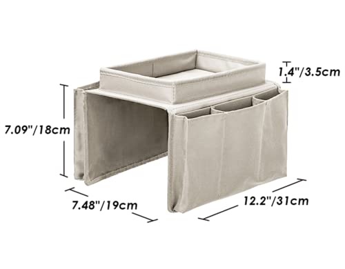 Product Description A good storage brings more convenience and joy to our life. Take the clutter out of your home and make everything organized. SIZE AND COLOR The size of this arm storage bag is 31x19x18cm/12"x7.5"x7", which is suitable for most sofas, chaise longues and chair armrests, hanging on the sofa you can easily and conveniently get what you need. And there are also four colors for you to choose: brown, gray, black, off-white. These colors can well match your various decoration styles. UNIQUE DESIGN AND DETAILS This armrest organizer has design pockets on both sides, and there is a dividing line in the middle of each pocket, you can store different items according to your needs. Objects can also be placed on top of the storage bag. There are many details in our sofa armrest storage, which can make you full of surprises after using it. APPLICATION Sofa, desk, table, etc. Neatly stores your remote TV control, flashlights, medications, cellphone, TV guide, magazines, notebooks, pens, glasses, snacks, and earphones. Organize gadgets in tidy, anti-lost and easy to find. An essential stuffs storage organizer in office, dorm rooms, department, dining room and bedroom. VARIOUS SCENARIOS