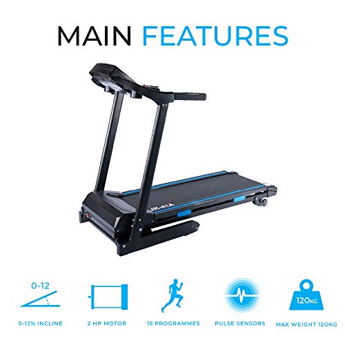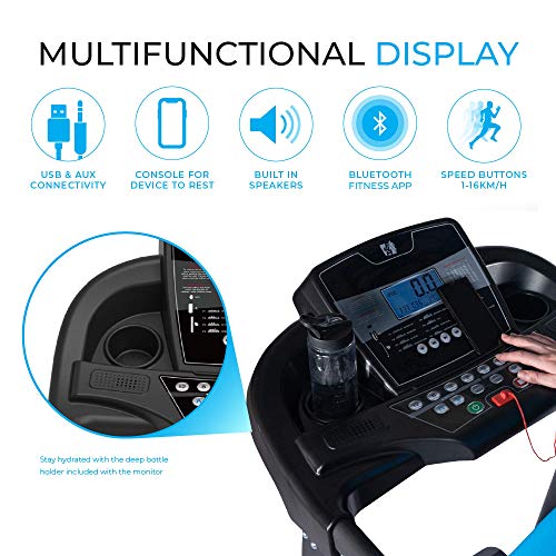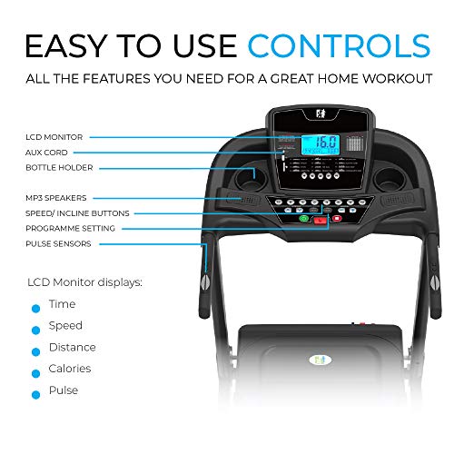 - The Fit4home JK41A treadmill has a Motor Power of 2HP, Window Display Function- LED Display displaying Scan, Time, Dist. Cal, Speed 1-16km/h, Auto Prog. P1-P8, shortcuts key. The treadmill mat is made from extra strong material meaning less stress on knees and longer durability. Bluetooth connectivity with the Fitshow app allowing you to track your workout.Best priced treadmill with exceptional functions.