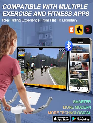 - 【Support Bluetooth Connection to Fitness Apps】It’s compatible with Zwift, Kinomap, Zsport, etc via bluetooth, more accurately monitor real-time exercise data. Tablet/Phone Holder also allows you to use your smart devices to watch shows while riding.