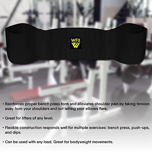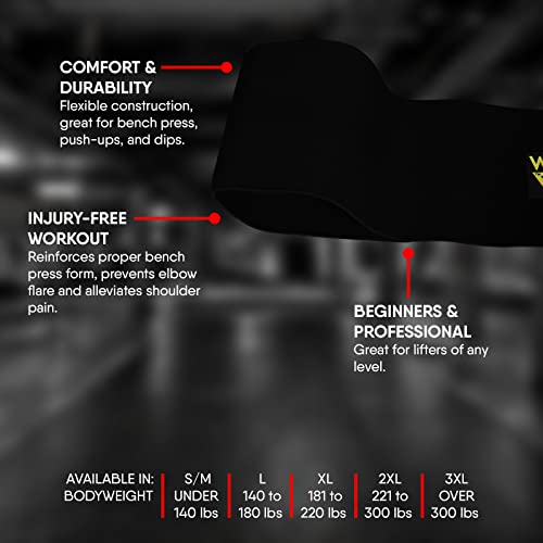 • Fitness bench blaster worn to drive the weights bar faster through sticking points while working out, benching, pushups or for assistance on ring dips and muscle ups to help lifters bench more deadlift loads of weight safely and without rotator cuff pain.