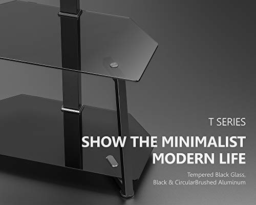 - 🔔【Stylish Corner TV Stand】The cantilever TV stand adopts black tempered glass shelves and oblique metal support frame in it’s design,classic and elegant.Good space saver when placed in the corner