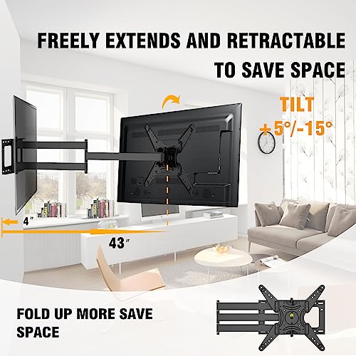 - Complete Range of Adjustment: Extends, articulates, tilts, swivels, levels and collapses on this long reach Full Motion TV Wall Mount. Making it ideal for corner installation, over a fireplace, or inside a TV center. Low-profile design ensures TV is close to the wall for a sleek finish.Cable management is included.