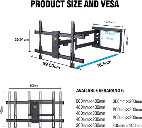 - 765MM LONG REACH TV Wall Bracket: Fits most 37"-75" Flat/curve TVs like Samsung, Sony, Panasonic, Thomson, TCL, Hisense, Toshiba, Sharp, LG, Philips, JVC etc VESA patterns from 200x100 up to 600x400mm (Not compatible 100x200mm), weighing up to 45kg.