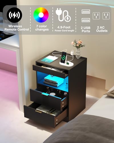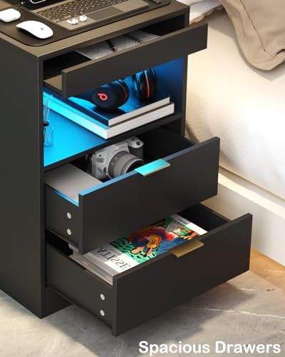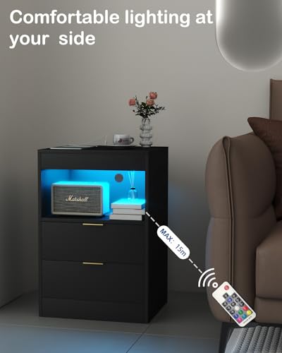 Gadroad LED Nightstand White Nightstand with Charging Station, Side Table with 2 Drawers and Light, Modern Bedroom End Table with Open Storage, S