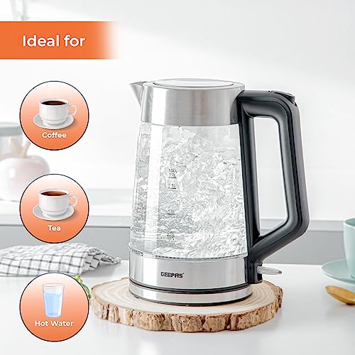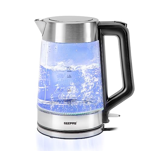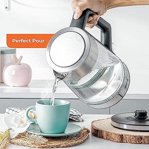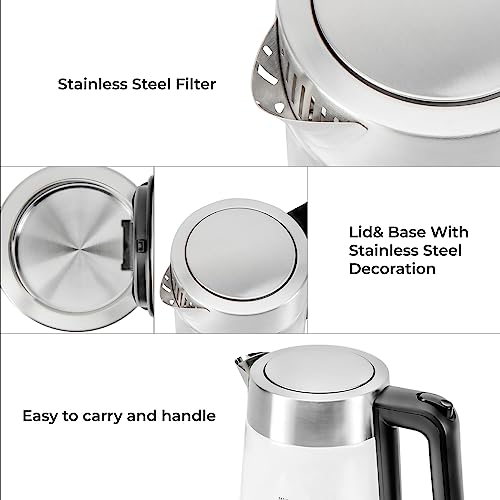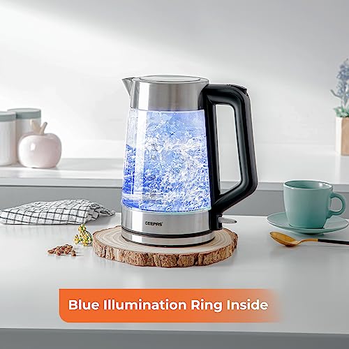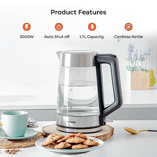 - ✅ BLUE ILLUMINATED LED LIGHT - Sleek and stylish design with clear housing, give you a precise observation with water volume and boiling process, and while the glass kettle will illuminate blue during heating water - An elegant addition to your kitchen. With a practical design, the kettle boasts 3000W power for rapid boil and a convenient water level indicator for ease of use. Perfect for tea, coffee, and more.