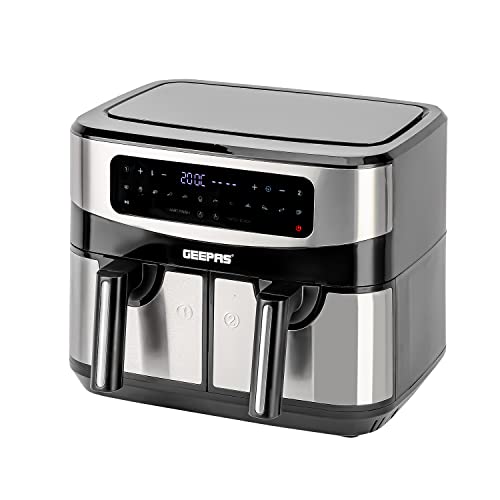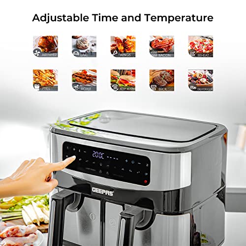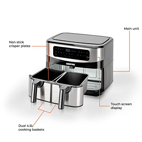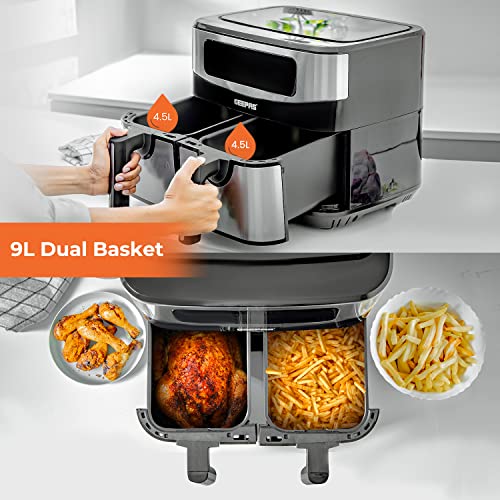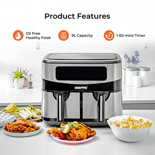 - ✅ 9L DUAL BASKET LARGE CAPACITY – With Two 4.5L non-stick baskets, 9L total capacity easily feeds a family of four or more, with a detachable non-stick cooking basket and tray for simple cleaning. The non-stick coated cooking basket and tray are dishwasher safe for easy cleaning.