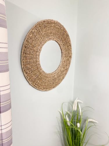- A very attractive piece, of crafted seagrass embracing a circular mirror. A natural rustic piece that is both fresh and elegant, suitable for any room in the home.