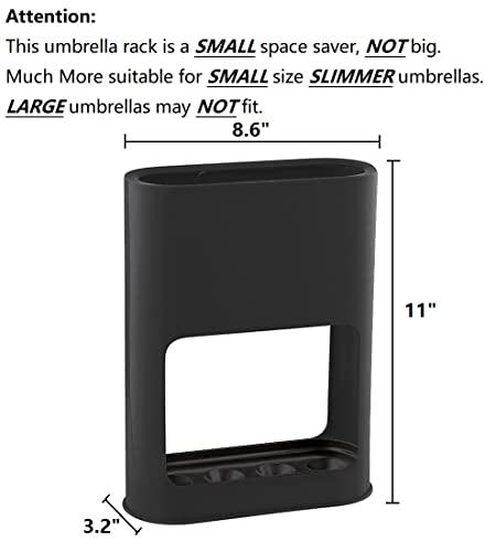 - ATTENTION: This umbrella rack is a SMALL space saver, NOT big. Much More suitable for SMALL size SLIMMER umbrellas. LARGE umbrellas may NOT fit. Dimension: 8.6"*3.2"*11"