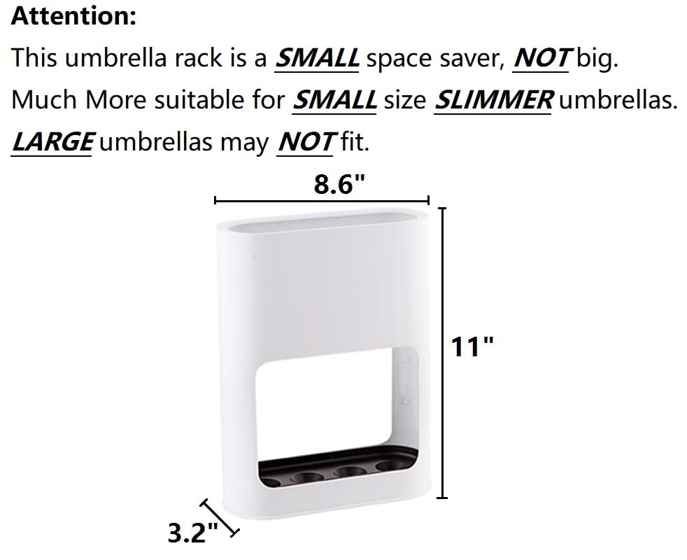 • ATTENTION: This umbrella rack is a SMALL space saver, NOT big. Much More suitable for SMALL size SLIMMER umbrellas. LARGE umbrellas may NOT fit. Dimension: 8.6"*3.2"*11"