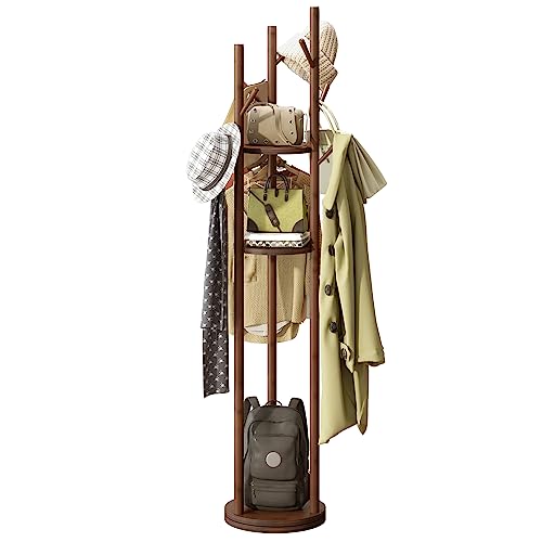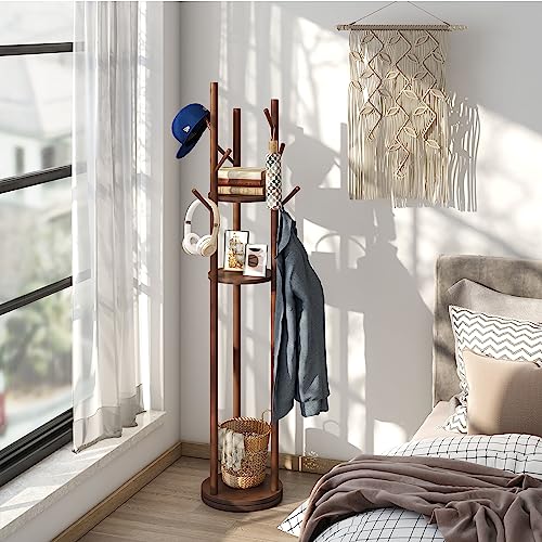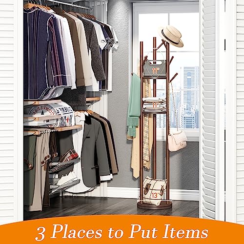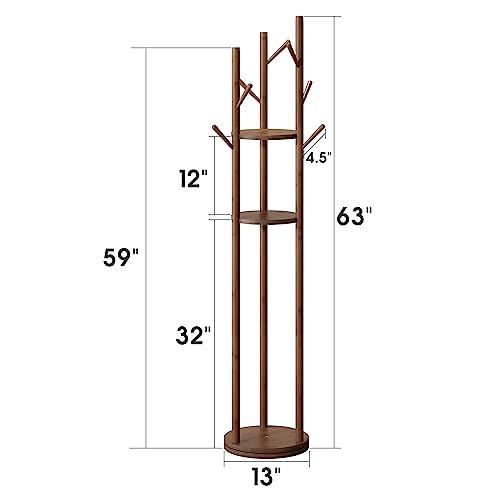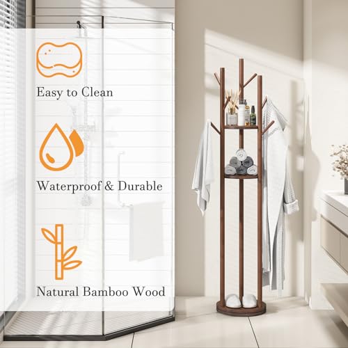 GHWIE Bamboo Coat Rack Freestanding, Coat Rack Stand with 3 Storage Shelves and 9 Hooks Easy to Assemble Coat Hanger Stand for Bedroom Office Hal