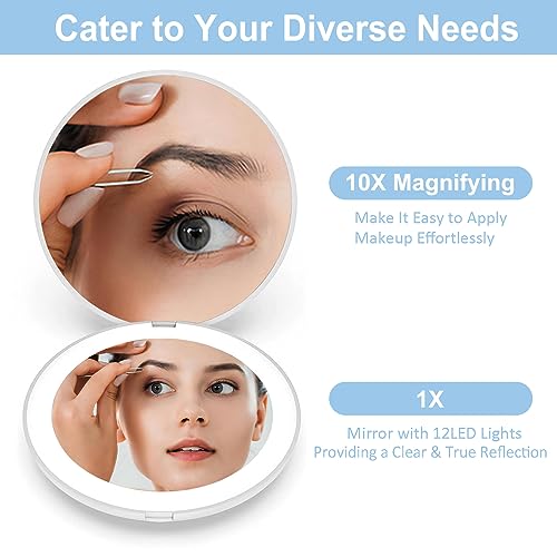 - 【Dual-Sided Makeup Mirror】On one side, enjoy a clear reflection with 1X regular mirror. On the other side, the 10X magnifying mirror reveals even the tiniest details with remarkable clarity. Perfect for precision tasks like tweezing, mascara application, plucking, lipstick touch-ups, flossing, and more
