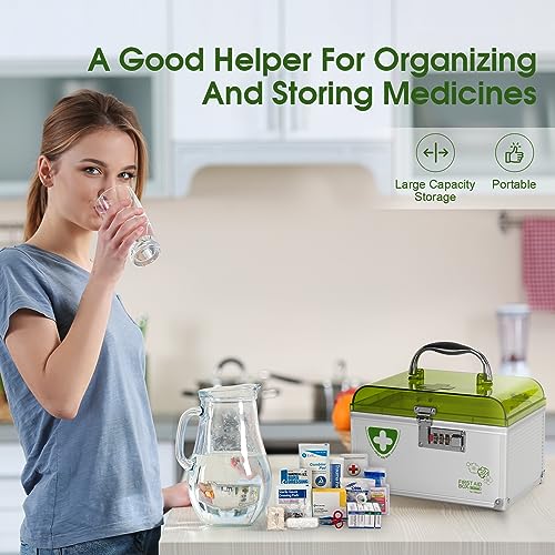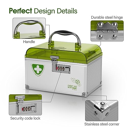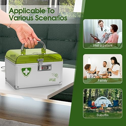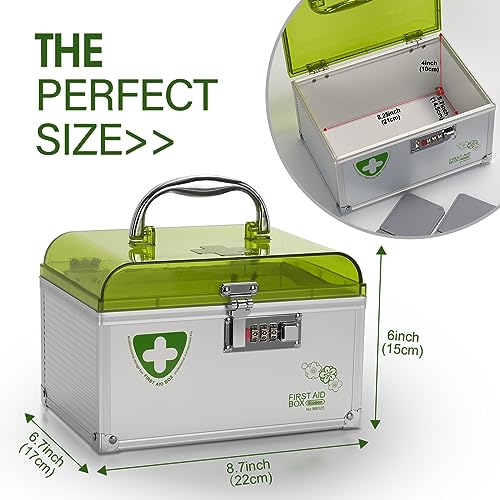 • Made of aluminum frame + MDF + removable plastic dividers with new generation combination lock and portable handle, easy to use and change; lock the medication away from children to prevent them from touching it, safer! Tip. Gently press and slide down the combination.