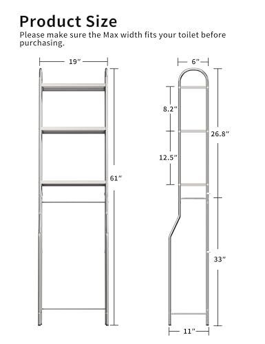 • Easy to Install - Clear instructions and included tools make assembly easy, with 4 removable hooks for easy use. With the bottom shelf 33" from the floor, this 19" L*11" W*61" H bathroom shelf is easy to place in the space behind the toilet.