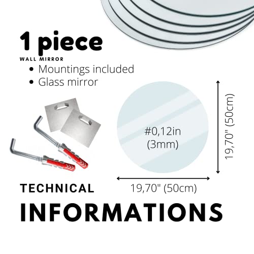 • 📏 SPECIFICATIONS: 50 cm x 50 cm x 1 cm. Pane thickness: 0,12 in. The mirror is round and doesn’t have a frame.