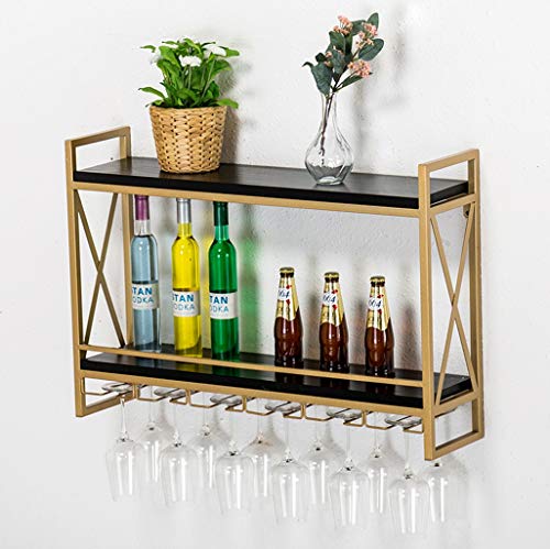 Golden Metal and Black Wood Board Wine Rack Wall Mount, Wall Floating Shelves for Restaurants Bars Kitchen, Wine Glass/Bottle Rack Wine Stemware