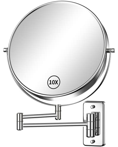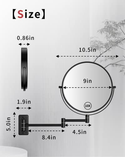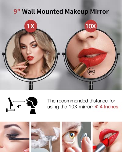 - [DUAL-SIDED 1X/10X MAGNIFICATION] : This wall-mounted mirror is double-sided design, the 1X side is designed for overall look. The 10X magnification side is suitable for detailed makeup, shave, comb your hair, etc. ( The recommended distance for using the 10X mirror: ≤4 inch )