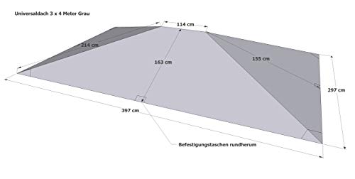 • Roof dimensions: 297 x 397 cm – does not stretch further. Diagonal (corner to tip): 214 cm.