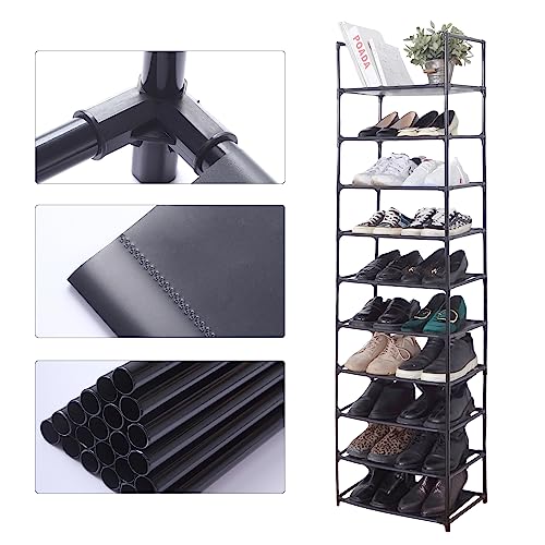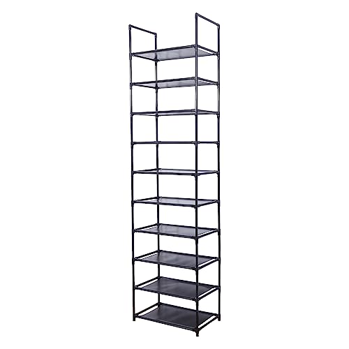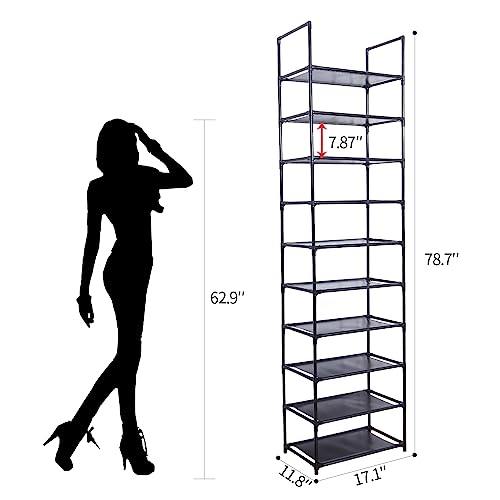 - 【STORE CAPAACITY】: 17.1D x 11.8W x 78.7H, 10-Tier Shoe Rackcan hold up 20-25 pairs of adult shoes, You can remove one layer to fit boots, high heels, bags or other larger accessories. Assemble a stackable shoe rack 9-tier or split into two shoes stand you like.This rack is not only for shoes, but also for bags, toys, towel, sundries, books, plants and small accessories.
