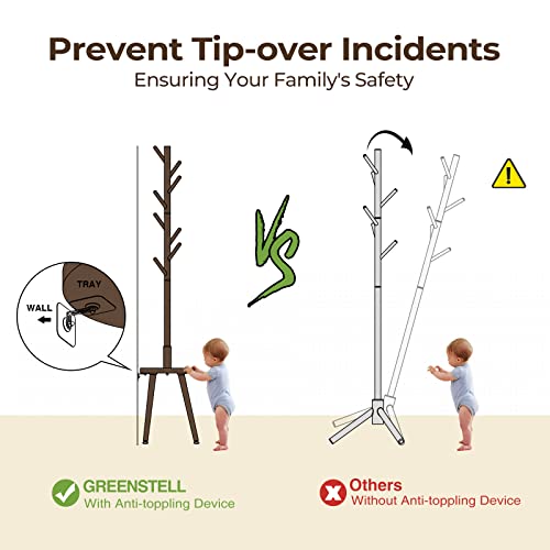 - 【Coat Tree Free Standing with Shelf & 8 Hook---Multifunctional Storage】: Greenstell's multi-functional standing coat rack is equipped with a tray with a radius of 13" and 8 hooks. Great for hanging coats, bags and hats, but you can also put your phones , glasses, headphones, keys and other items in our tray, the lip around the tray is designed to protect the items from falling.