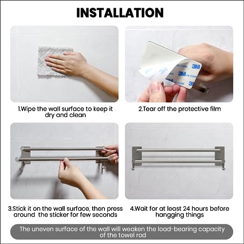 - 【Strong Adhesion】Strong 3M adhesive tape has strong adhesion and load capacity 5kg. 6 pieces of backing tape, with 4 spare pieces, easy for you to reuse and carry. The self-adhesive towel rail is easy to clean and sturdy, don't use it above wallpaper, painted and lime walls, radiators, fabrics, rough porous or fibrous surfaces, otherwise stickiness will be affected.