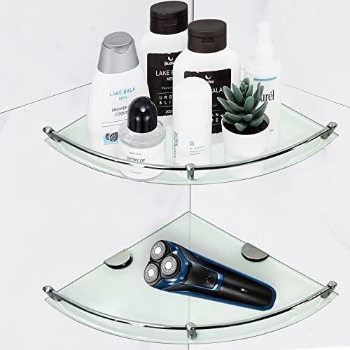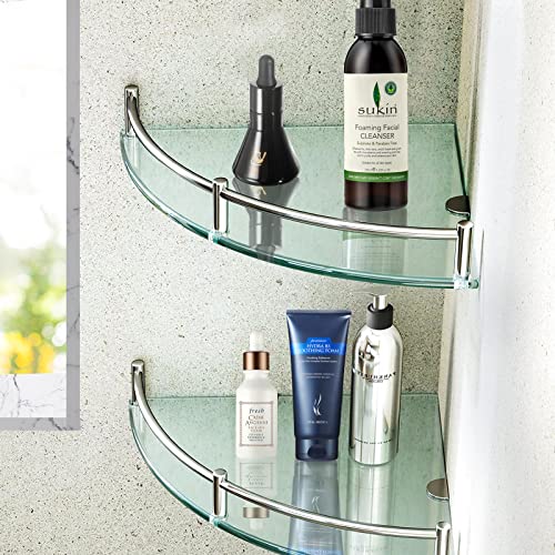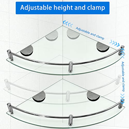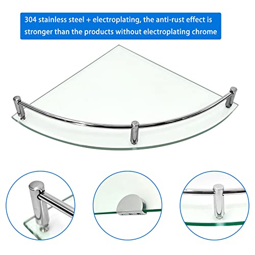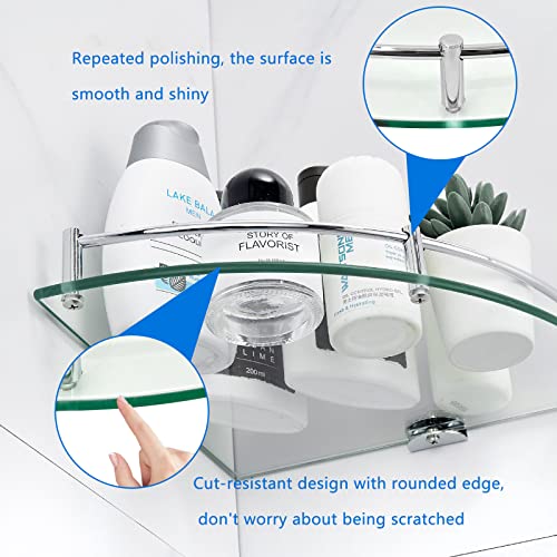 - 【Round Edge Does Not Hurt Your Hands】The edge is rounded, multi-layer polishing and polishing, which is safe to use. Never scratch your hands, and there are stainless steel rails to keep your toiletries from falling. This glass shelf fits any corner and keeps your bathroom organized and clean.