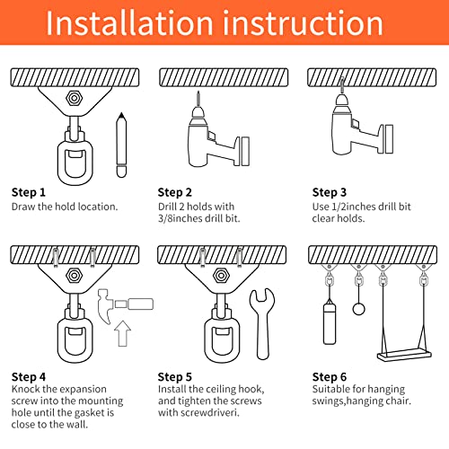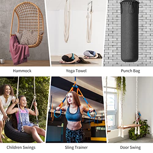 • Ceiling Hook for Swing: Contains 1pc*swing swivel hook, 2pcs*expansion screws, 2pcs* screws, 1pcs* carabiners, 2* Plastic plug, The 360° rotate hammock hooks for the ceiling kit can load up to 450kg with a high load capacity, very great for hanging the hammock chair, swing, punchbag, and yoga strap to indoor and outdoor relaxation. Can also be used for hanging heavy objects in the garage