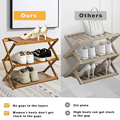 - Full Board Design: In order to suitable for all shoes, the 3 tier bamboo small shoe rack has chosen a full board design with no gaps. Putting high heels on the board and no longer worrying about the heel getting stuck in the gap.