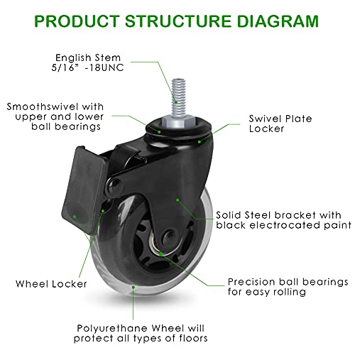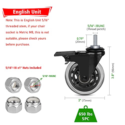 - HEAVY DUTY CASTER - Steel structures body is extremely hard wearing and resistant to dirt, 600 lbs capacity for 5 pack 3 INCH casters, can be widely used for most chairs and other furniture with IMPERIAL STEM 5/16” only.