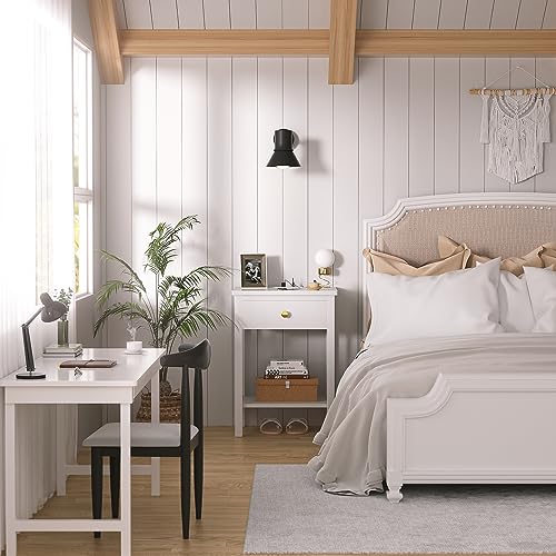 - Large Storage Space: Generous storage includes a wooden drawer and an open shelf. Drawer interior measures 11.7” L x 11.6” D x 4.4” H. Gold-tone metal knob and smooth groove allow the drawer to open and close smoothly, drawer with pull-out stop. Perfect for storing away all of your bedside necessities and keeping them within reach.