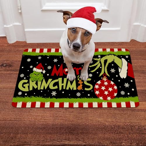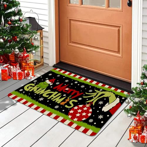 • 【GRINCH-THEMED DESIGN】 Christmas door mats for front door is designed as Merry Grinchmas on Black Background pattern. Christmas door mat outdoor can create a holiday atmosphere for outside entry.