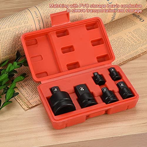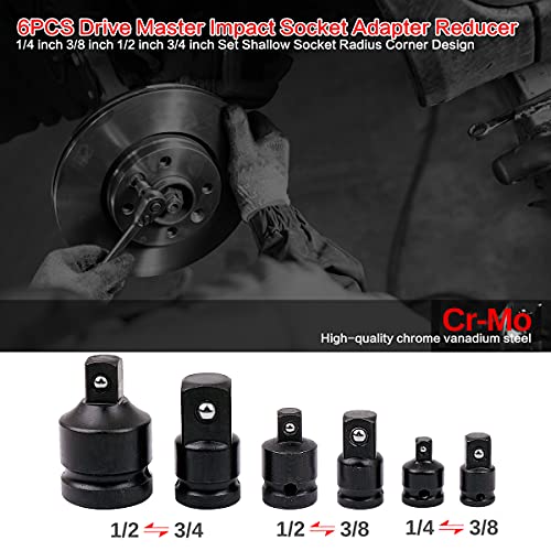 Product Description Do you want a new sets of tools for industrial, mechanical, or construction work? The 6-Piece Adapter Set made from high-strength, heat treated chrome vanadium steel with a corrosion-resistant nickel/chrome plated finish CRV. Allowing you to use the socket sets you already have to make repairs that require other drive sizes, saving you the trouble and expense of having to buy new sets of tools. SET INCLUDES: This adapter set includes 3 pc. reducers and 3 pc. adapters: 1/4-inch drive (F) to 3/8-inch drive (M) 3/8-inch drive (F) to 1/4-inch drive (M) 3/8-inch drive (F) to 1/2-inch drive (M) 1/2-inch drive (F) to 3/8-inch drive (M) 1/2-inch drive (F) to 3/4-inch drive (M) 3/4-inch drive (F) to 1/2-inch drive (M) These adapters and reducers are made from high-strength, heat treated chrome vanadium steel, and nickel/chrome plated finish is corrosion-resistant to eliminate chance of rust for a long lasting tool life, for industrial, mechanical or construction work. These adapters and reducers are made from high-strength, heat treated chrome vanadium steel, and nickel/chrome plated finish is corrosion-resistant to eliminate chance of rust for a long lasting tool life, for industrial, mechanical or construction work. The adapters' spring-loaded detent balls securely latch sockets, Get the most out of your sockets with this handy set of adapters and reducers that insure you'll always have the right size for the job. Socket adapter set can be used with impact wrench. Impact socket set can be used with manual wrench. Impact wrench adapter comes with plastic case for easy storage and transport of all components.