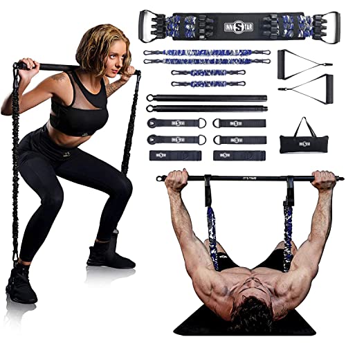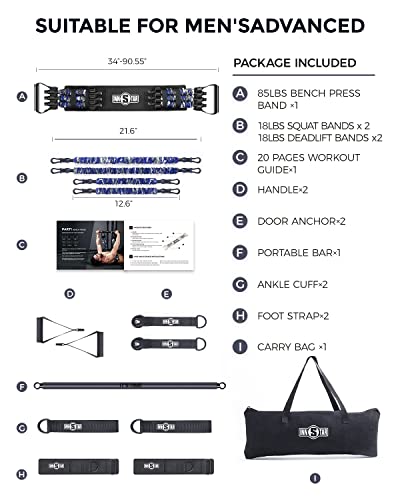 - ★PROFESSIONAL QUALITY FITNESS EQUIPMENT: High quality resistance band for heavy duty exercises. Nature latex material resistance band with 38” workout bar, 2*21” Squat bands+2*12.6” Deadlift bands for full body exercises. Also come with 1*multifunctional strap, 2*door anchors, 2*foot straps, 2*ankle cuffs and 2*handles + 20 pages workout manual for your home exercise.