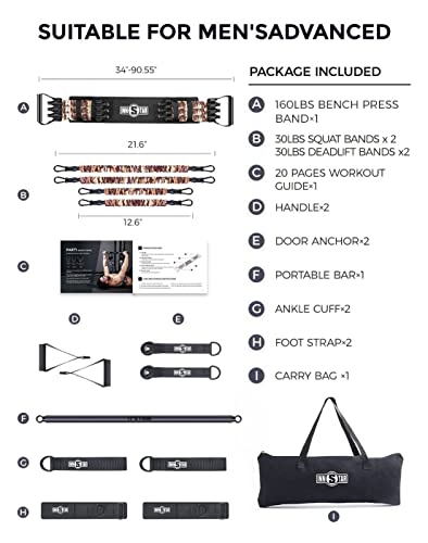 • ★PROFESSIONAL QUALITY FITNESS EQUIPMENT: High quality resistance band for heavy duty exercises. Nature latex material resistance band with 38” workout bar, 2*21” Squat bands+2*12.6” Deadlift bands for full body exercises. Also come with 1*multifunctional strap, 2*door anchors, 2*foot straps, 2*ankle cuffs and 2*handles + 20 pages workout manual for your home exercise.