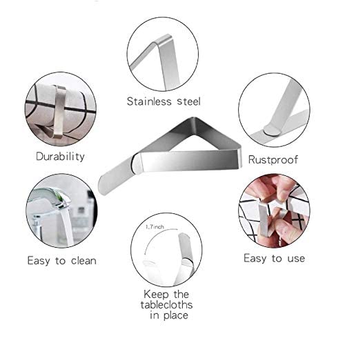• 【High Material】Made of premium #201 stainless steel, which is harder than other clamps that made of #430, durable and rust resistant, hold tablecloths tight, lays flat. Can be used repeatedly but needs to be stored in a cool, ventilated area to better prolong the life of the tablecloth clips.