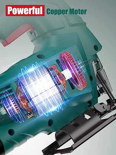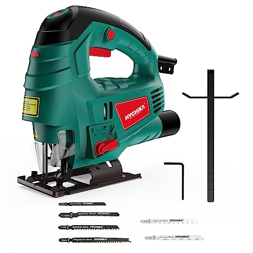 - 🌟【750W Motor and 6-Speed Setting】HYCHIKA jigsaw has a 750W powerful copper motor with a 6-speed controller, which can adjust the speed from 800 to 3000 RPM. Contains 6 saw blades (2 for metal and aluminum, 4 for wood and plastic), you can choose the right saw blade according to the material.