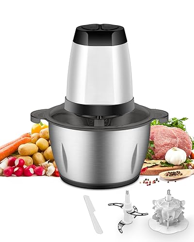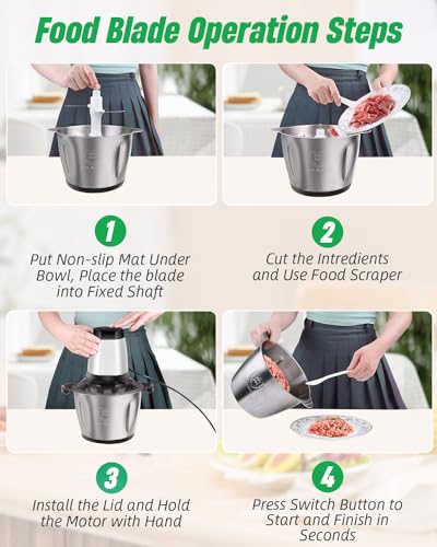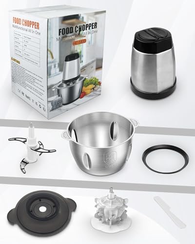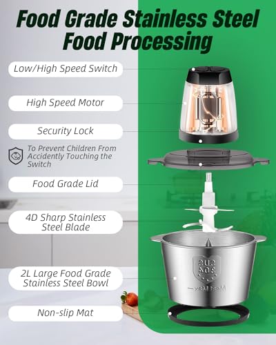 - Large Capacity Design: Our mini chopper featuring a roomy 2L stainless steel bowl made from 304 food-safe grade stainless steel, it provides plenty of room for your ingredients. Unlike flimsy glass bowls, stainless steel is designed for superior sturdiness, health, and shock resistance for long-lasting use. And it is equipped with anti-slip rubber pads to fix the bottom and run smoothly.