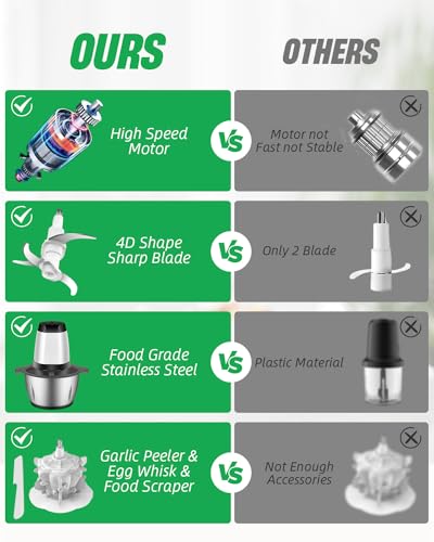 - Multifunctional: Our complete kit includes a 2-liter capacity food grinder, 4 double decker blades, a 2-in-1 garlic peeler and a meat scraping tool. Together, these components form a versatile electric food processor that easily handles the tasks of chopping, blending, mixing and grinding a variety of ingredients. Among them is the 2-in-1 Garlic Peeler, which efficiently peels off the outer skin of garlic cloves, with a removable design and a lower layer that can be used as a blender.