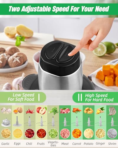 - Simple to Use: With two-speed options, simply press the pulse button to switch between fine grinding and coarse grinding modes, allowing you to process various foods effortlessly. This versatile kitchen electric chopper excels at evenly chopping or dicing vegetables, nuts, cheese, meats, and fruits in mere seconds. It's the ideal companion for crafting meat fillings, vegetable salads, tomato ketchup, and a wide range of other food preparations.