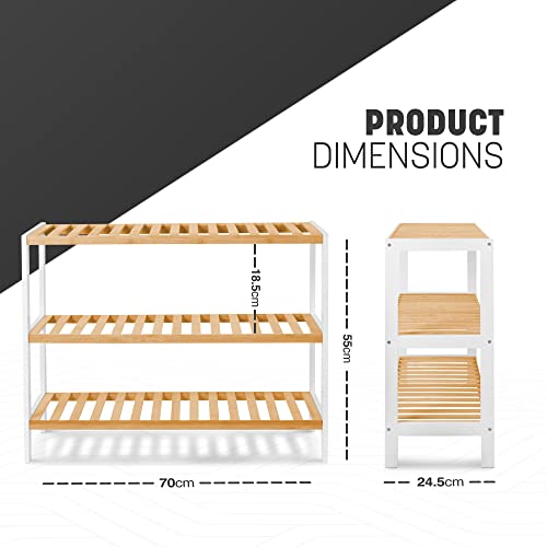 - The rack measures 55x70x55 cm with three spacious tiers. This shoe rack can comfortably hold up to 12 pairs of shoes, allowing you to keep your footwear organised. The compact size of this shoe rack makes it easy to store in small spaces, such as closets or entryways, helping you to utilize your space more efficiently.