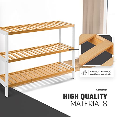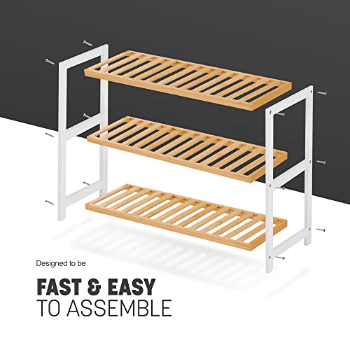- The 3-Tier Bamboo Shoe Rack is designed with ease of assembly in mind. With all the necessary hardware included, the assembly process is quick and straightforward and can be completed in just a few minutes. Once assembled, the shoe rack is incredibly sturdy and durable, providing you with a long-lasting storage solution that is built to last.