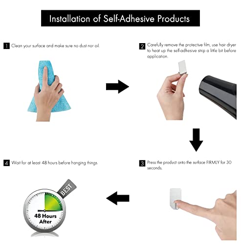 - Note: Self-Adhesive strip installation is suitable for flat and smooth surfaces without dust or water, such as tile, glass, and metal. DO NOT apply this product on fabrics nor wallpaper as it may damage these surfaces. Please wait for 48 hours before use.