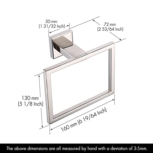 • Dimensions: 6.3-inch (160mm) in length, 5-inch (130mm) in width. The ring’s projection is 2.8 inches. The ring provides huge storage space and the towel won’t touch the wall.