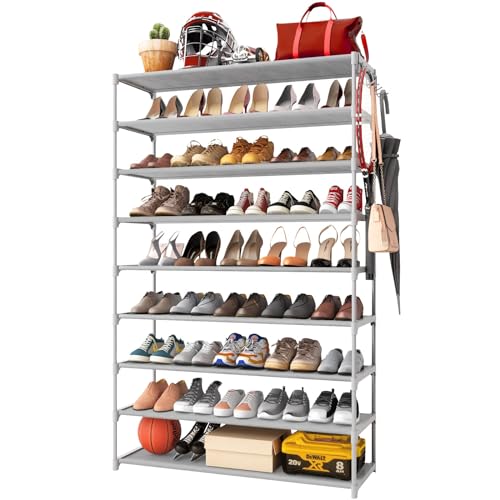 Kitsure 9-Tier Tall Shoe Rack for Closet - Shoe Organizer with Hook Rack, Large-Capacity of 36-45 Pairs, Metal Space-Saving Shoe Shelf for Entryw