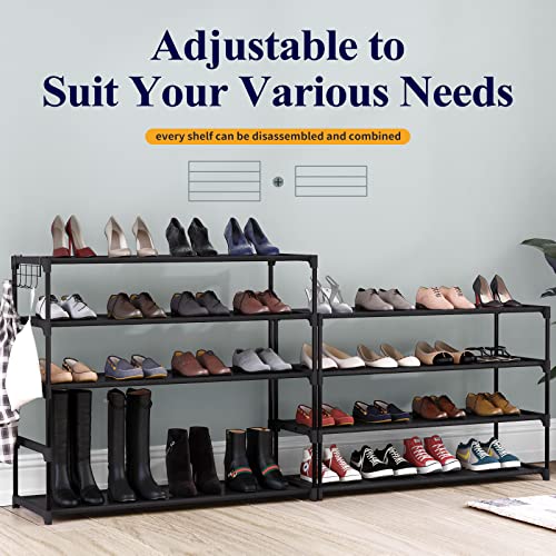 • LARGE CAPACITY: The Kisture 9-tier closet shoe rack organizer (34.3'' L x 11.8'' W x 55.1'' H) with its 6.7'' tier space can house 36-45 pairs of shoes of all styles. Its 11.8'' depth accommodates even shoes up to US size 12! This tall shoe rack includes a hook rack that provides extra space for bags, keys, and other accessories.