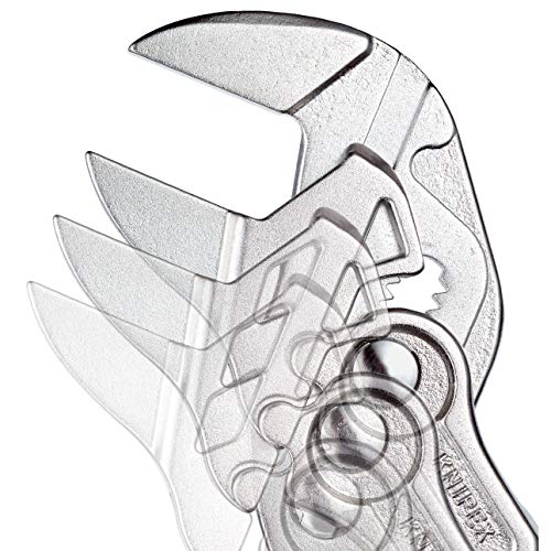 From the manufacturer Pliers and wrench in a single tool The Knipex pliers wrench 86 03 250 – for classic applications such as plumbing The pliers wrench combines many functions: It replaces an entire set of wrenches in metric and imperial sizes, can be adjusted very quickly and directly on the workpiece at the touch of a button, as well as handling all gripping widths up to 52 mm or 2 inches thanks to infinite adjustment. The joint pin engages securely, preventing unintentional shifting. The smooth gripping jaws are parallel to each other and grip the workpiece without damaging edges or sensitive surfaces – work directly on chrome! Screws, grips, holds, bends and presses Replaces a full set of wrenches Grips continuously up to 52 mm or 2 inches Protects sensitive surfaces 10-fold manual force amplification Direct working on chrome, brass, etc. Fast adjustment on the workpiece at the touch of a button Chrome vanadium heavy-duty steel, oil hardened The KNIPEX pliers wrench 10-fold amplification of manual force: The excellent mechanics of the pliers wrench increases the applied manual force 10 times. It holds workpieces securely like a vice. Even flat objects can be gripped and processed easily thanks to the high pressing force and the parallel jaws. Damage-free application Work on finished or very sensitive surfaces (e.g. fittings in the bathroom) can be carried out damage-free (similar to illustration). Ratchet principle The special stroke of the gripping jaws enables time-saving screwing according to the ratchet principle. Fast push-button adjustment Replaces a complete set of wrenches: It can be adjusted directly on the workpiece (up to 40 mm / 1 1/2 inch) using a push button. Laser-cut size scale The redesigned KNIPEX pliers wrench features two laser-cut scales: metric on the front, imperial on the back. This means that you can set the gripping capacity in advance for workpieces that are more difficult to reach. 86 03 250 86 01 250 86 02 250 86 05 250 86 06 250 86 43 250 EAN 4003773- 033837 082385 082392 047841 082408 081296 Surface chrome plated black atramentized black atramentized chrome plated chrome plated chrome plated Handles plastic coated with non-slip plastic coating with multi-component grips with multi-component grips plastic coated plastic coated Adjustment positions 19 19 19 19 19 17 Capacity (mm/inch) 2 in 2 in 2 in 2 in 2 in 1 3/4 in Length (mm) 250 mm 250 mm 250 mm 250 mm 250 mm 250 mm Weight (g) 480 g 480 g 505 g 515 g 560 g 575 g