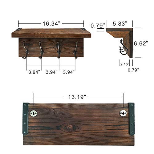 Product Description Color: dark brown Material: solid wood,rustic metal hooks, strong natural rope Item Size: 16.65''L x 20.47''H x 2.35''W ; 3.9’’ deep shelf ; 12 hooks Item Weight: 4.4lbs Hardware: wall mounting screws and anchors are included Sturdy Multi-functional Storage Shelves Rustic dark brown wooden mug rack is made out of solid wood, crafted into a large mug rack entirely by hand. This wall mug rack holds plenty of mugs and organizes cooking utensil one time, letting you display all of your cute-themed mugs that would otherwise be hidden away taking up space in a cabinet. Mug rack & Kitchen Floating Shelves has plenty of Storage Rustic wood & Natural jute rope It uses the unique design of natural solid wood and jute rope. Handmade, retro but fashionable, it can ideally decorate your kitchen, bar, living room, and anywhere you like. Maximum capacity shelf The floating wall shelf of the top can be used to store coffee bags, coffee grinder, beans, tea bags, cookbooks and more. Solid wood & metal hooks Coffee mug holder is made of 100% natural solid wood, instead lightweight wood.Three tiers, each featuring 4 hooks, give you a total of 12 storage spaces for mugs or teacups to be organized yet easily accessible. Concealed wall-hanging design The rustic mug rack arrives fully assembled and hanging hardware is included, the board is pre-drilled to make the wall hanging process easy and you just had to pop two nails into your wall to hang it up Mug Holder Coat Rack with Shelf Coat Hook Rail mason jar wall decor growth chart for kids size 16.65''L x 20.47''H x 2.35''W ; 3.9’’ deep shelf ; 12 hooks 16.34''L x6.62''Hx5.83''W 2 pcs 16.35''L x 5.31''Hx3.35''W 11.81 ''x 5.12'' x 5.13 '' 83''*1.97''/210CM *5CM(L*W)
