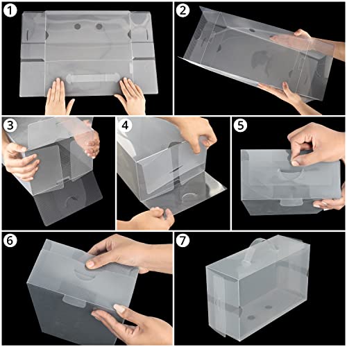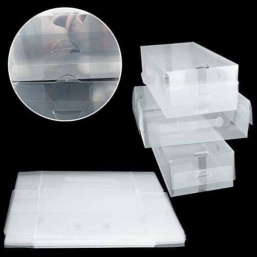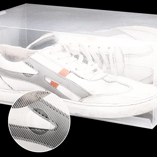 - STACKABLE STORAGE: Each storage box is corrugated and has tabs, which interlock when another box is stacked on top. This makes the boxes easy to stack and will stop them from falling over. Since the boxes are transparent, you can easily select your favourite pair of kicks to wear each day. Suitable for most shoes from heels, trainers, hiking boots, sports shoes, dress shoes, flip flops, sandals, loafers, boots, slippers and more.
